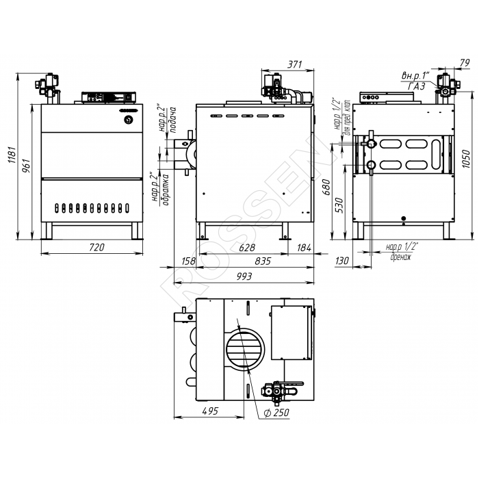 Котел RSA 120 имеет открытую топку и оборудован атмосферной горелкой. Теплообменник производится на Заводе Rossen, выполнен из оребренных труб с увеличенной поверхностью теплоотдачи.