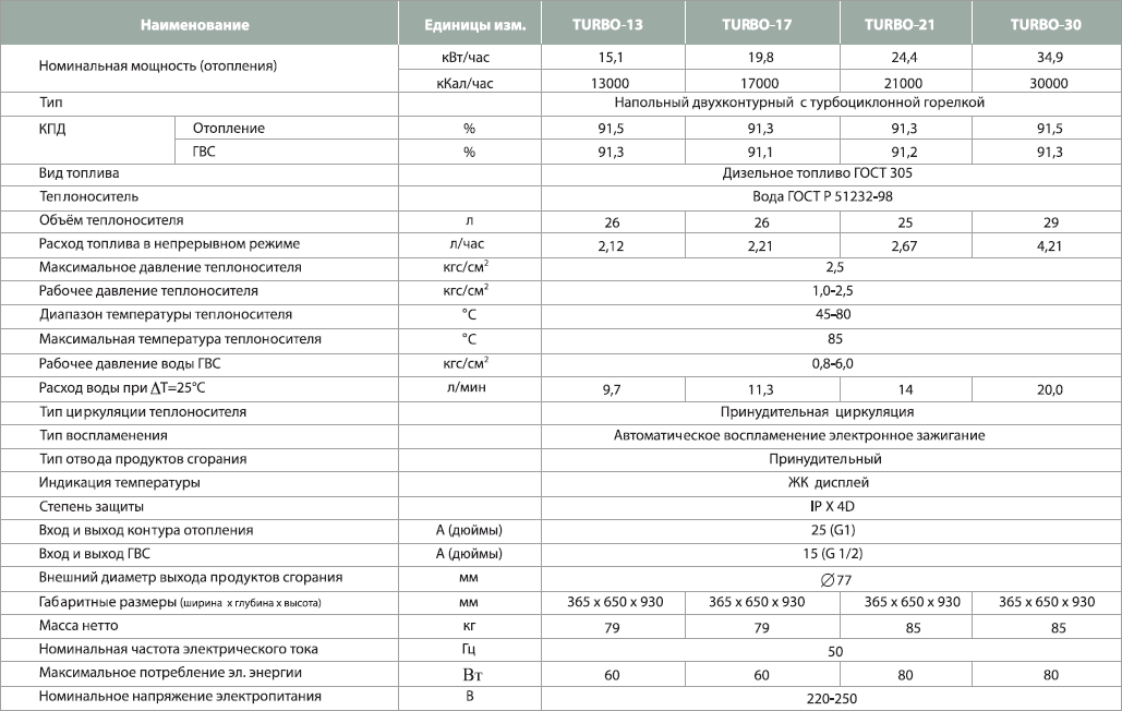 Технические характеристики дизельного котла Kiturami Turbo 21R указаны в таблице ниже, а также в паспорте котла Kiturami Turbo 21R во вкладке "Документация".