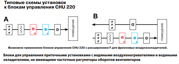 Блок управления CHU 220-W-31 предназначен для управления приточно-вытяжной установкой вентиляции с водяным воздухонагревателем и водяным охладителем.