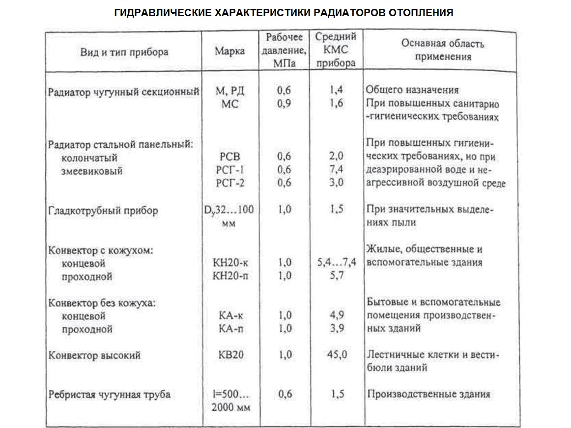 Таблица с гидравлическими характеристиками разных видов радиаторов отопления - рабочее давление и коэффициент местного сопротивления