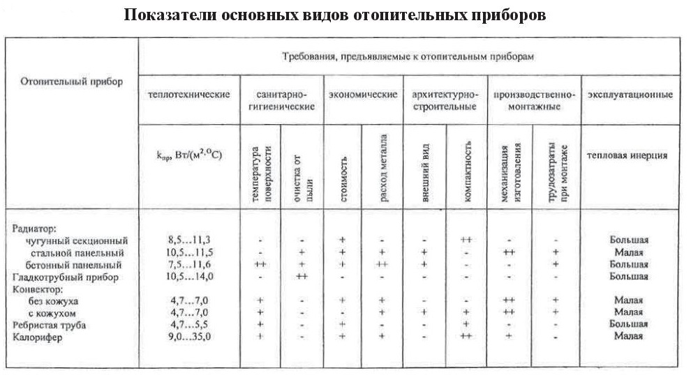 Таблица с характеристиками радиаторов отопления
